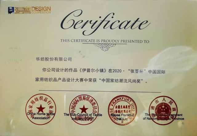 導(dǎo)讀:9月2日,以“潮流·生活”為主題的2020·“張謇杯”中國國際家用紡織品產(chǎn)品設(shè)計(jì)大賽頒獎(jiǎng)盛典在江蘇南通舉行。公司家紡作品《伊普爾小鎮(zhèn)》,榮獲“中國家紡潮流風(fēng)尚獎(jiǎng)”。