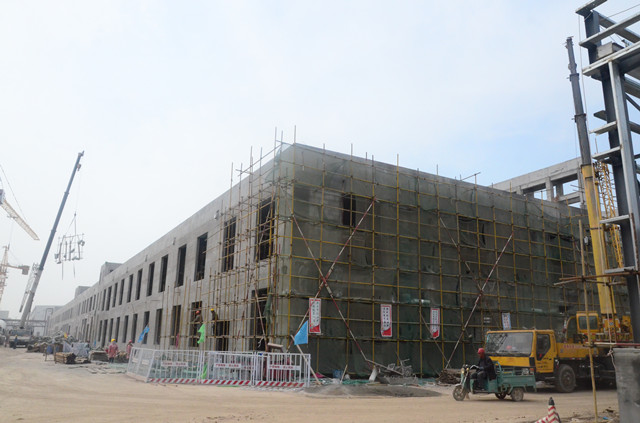 我們在王平帶領下,在新廠房外圍參觀了一遍。他邊走邊說,面料車間整體完成進度85%,車間主體工程已經建設完成,設備基礎在緊鑼密鼓的建設中,預計6月底整體達到投產狀態,8月底完成全部搬遷;家紡車間整體完成度80%,車間主體工程已經建設完成,鋼結構工程在加緊安裝中,預計6月底整體達到投產狀態,8月底完成全部搬遷;服裝車間整體已經全部完成,達到了整體搬遷條件;污水處理整體完成度95%,車間主體工程已經建設完成,脫水機房工程尚在緊張建設中,預計4月底可投產運行;食堂主體完成度95%,一二層主體工程已經建設完成,預計在3月底能達到投產狀態,三層尚在緊張裝修中,預計4月底能達到投產狀態;助劑加工車間、紙管廠完成度65%,主體工程已經基本建設完成,預計6月份達到投產狀態。