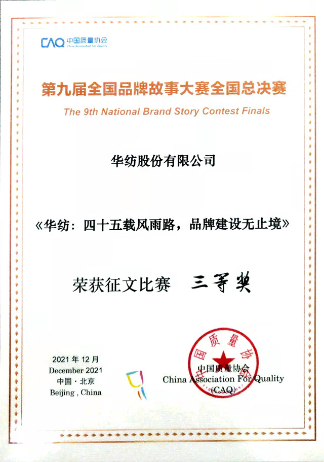 日前,第九屆全國品牌故事大賽落下帷幕,各獎項均有歸屬。公司文化中心陳光娥撰寫的征文作品《華紡:四十五載風雨路,品牌建設無止境》榮獲三等獎。