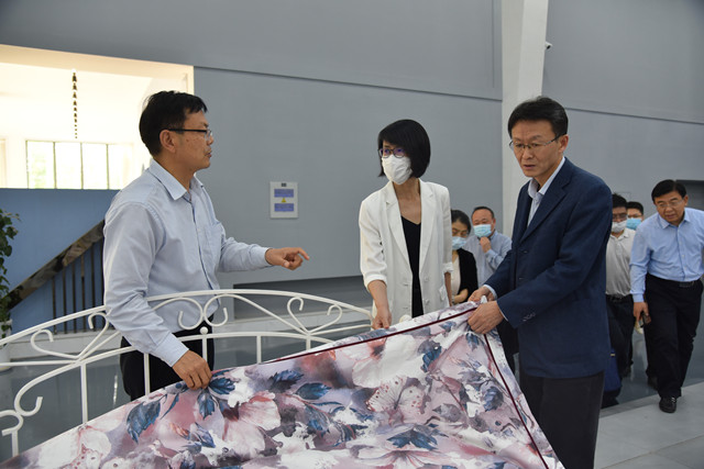 調(diào)研組一行先后到公司智云中心、檢測中心、綜合辦公區(qū)、服裝面料展廳、花布展廳、家紡展廳、創(chuàng)意設(shè)計中心、工程技術(shù)研究院、花布車間生產(chǎn)現(xiàn)場等實地調(diào)研,詳細(xì)了解了企業(yè)運行、市場營銷、科技創(chuàng)新、戰(zhàn)略規(guī)劃等情況,詢問企業(yè)發(fā)展過程中遇到的問題和困難,并聽取了公司董事長盛守祥對公司總體生產(chǎn)經(jīng)營情況的匯報。調(diào)研組對公司多年來的發(fā)展成績給予了充分肯定,并表示華紡公司多年來深耕紡織印染領(lǐng)域,不斷做大做強(qiáng)、是一家高質(zhì)量發(fā)展、成長性良好的企業(yè);同時,企業(yè)在發(fā)展的過程中積極履行社會責(zé)任,體現(xiàn)了企業(yè)的社會擔(dān)當(dāng)。