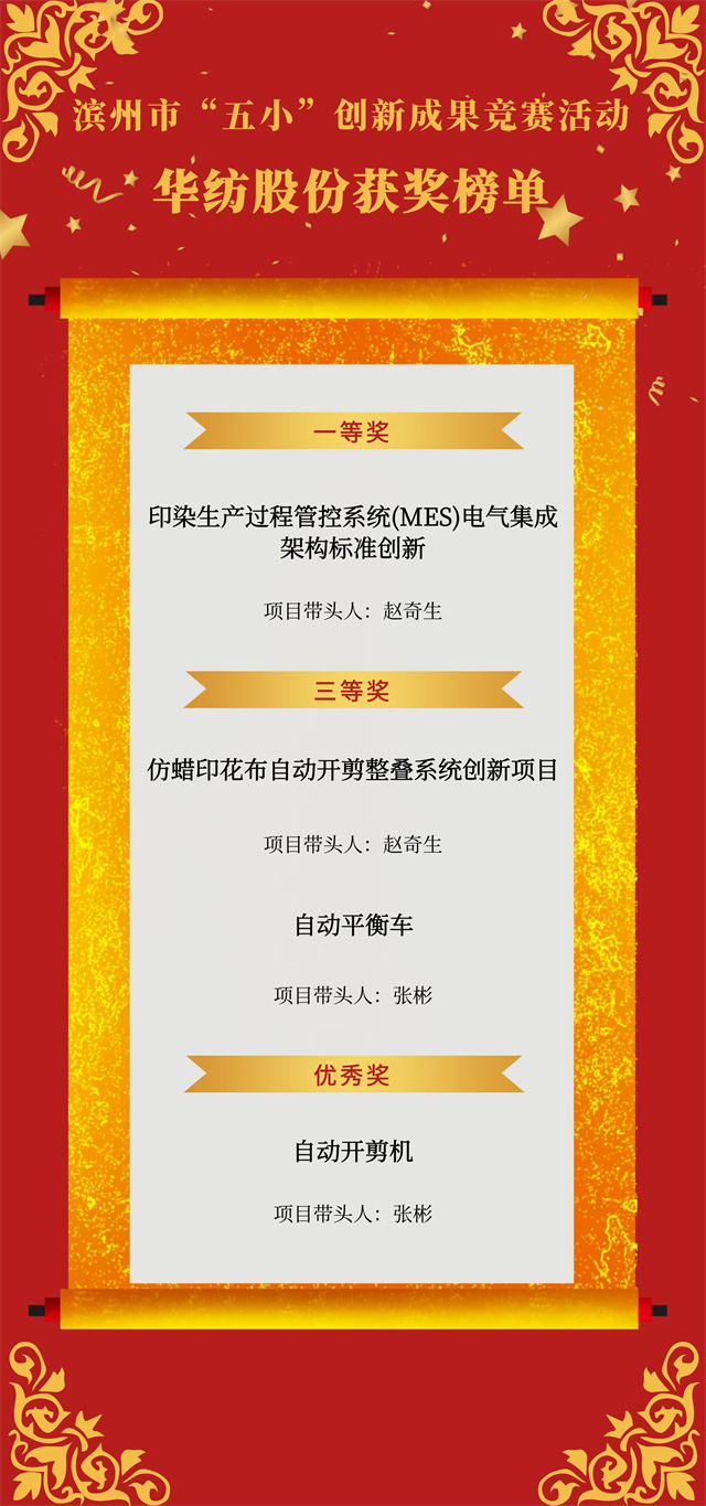 近日,市總工會(huì)開展的濱州市“五小”創(chuàng)新成果競(jìng)賽活動(dòng)獲獎(jiǎng)名單公布,公司申報(bào)的4項(xiàng)“五小”競(jìng)賽創(chuàng)新成果喜獲殊榮,其中,《印染生產(chǎn)過程管控系統(tǒng)(MES)電氣集成架構(gòu)標(biāo)準(zhǔn)創(chuàng)新》獲一等獎(jiǎng),《仿蠟印花布自動(dòng)開剪整疊系統(tǒng)創(chuàng)新項(xiàng)目》《自動(dòng)平衡車》獲三等獎(jiǎng),《自動(dòng)開剪機(jī)》獲優(yōu)秀獎(jiǎng)。