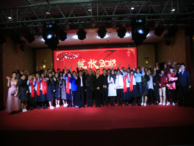 晚會結束后,公司總經理閆英山等公司領導與參加演出的員工合影;來自突尼斯的天津工業大學見習生琺嘟娜受邀登臺,參加了合影。