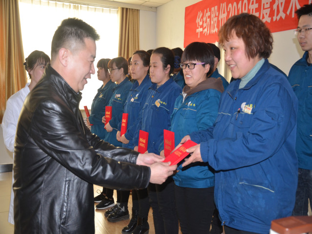 總工程師羅維新宣讀了《關于對2018年度綜合評比獲獎團隊及個人的表彰決定》和《關于對染整專業技術培訓班(第七期)劉江等15人準予結業的通報》;黨委書記、董事長王力民為獲得表彰的優秀團隊面三車間技術團隊頒發獎狀;總經理閆英山為27名優秀技術人員和15名輪訓班結業人員頒發相應證書。優秀技術人員代表韓延衛和優秀打樣員代表張齊先后發言。